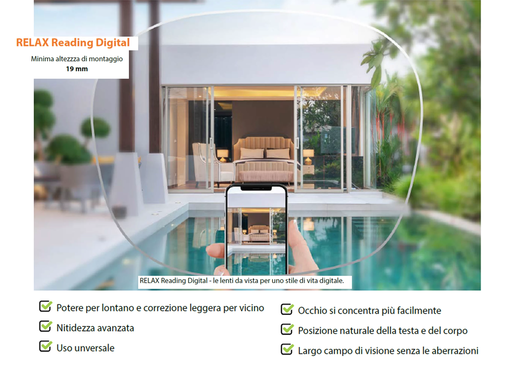 Le lenti migliorano la messa a fuoco per la visione da vicino, garantendo una nitidezza superiore e riducendo l’affaticamento visivo durante la lettura e l’uso intensivo di smartphone, tablet o computer.